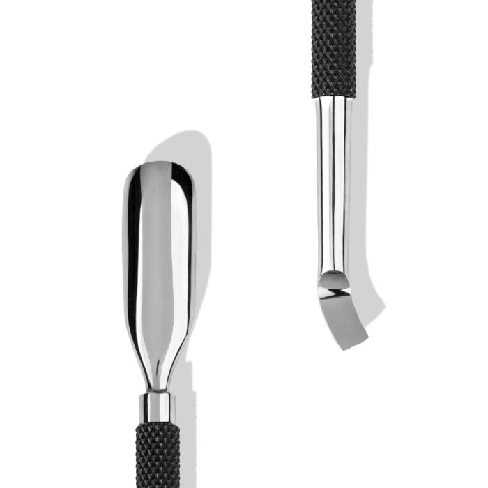A ponta oblíqua é ideal para empurrar cutículas espessas e remover resíduos aderentes à superfície da unha. Já a ponta curva adapta-se ao contorno natural da unha, facilitando a limpeza subungueal com segurança. O formato maxi oferece maior dimensão e firmeza no manuseamento, sendo ideal para áreas mais amplas como os pés.