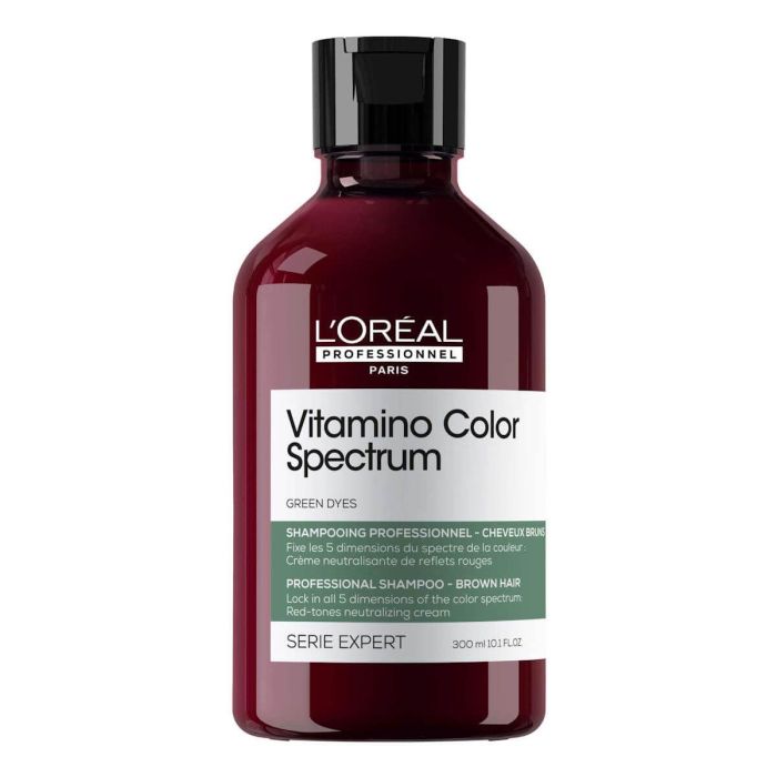 O L'Oréal Vitamino Color Spectrum Verde Shampoo que elimina os reflexos vermelhos. Especialmente formulado para cabelos castanhos escuros pintados, este shampoo profissional neutraliza os subtons quentes, devolvendo profundidade e um tom castanho frio e uniforme. Devido aos pigmentos verdes e à tecnologia patenteada, protege a cor até 100 dias, evita o desbotamento e prolonga a duração da cor. Com uma fórmula cremosa limpa, nutre e fortalece a fibra capilar, deixando o cabelo mais macio, brilhante e vibrante. Ideal para manter o castanho escuro impecável e cheio de vida entre colorações.
