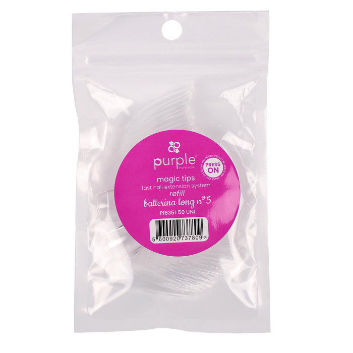 As Magic Tips Ballerina Long Recargas N.º 5 da Purple foram criadas para proporcionar extensões de unhas no formato ballerina, caracterizado por laterais retas e ponta levemente afunilada, resultando num visual moderno e sofisticado.