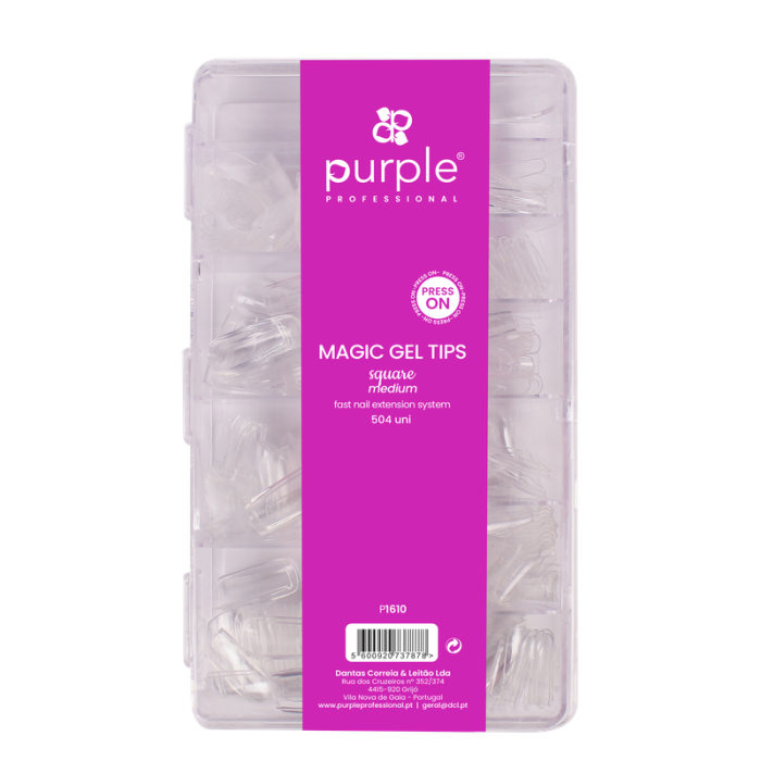 As Magic Tips Square Medium da Purple foram desenvolvidas para criar extensões de unhas no formato quadrado médio, combinando laterais retas e ponta plana para um visual clássico e versátil. Este estilo adapta-se a diferentes técnicas e tendências, mantendo um acabamento elegante.